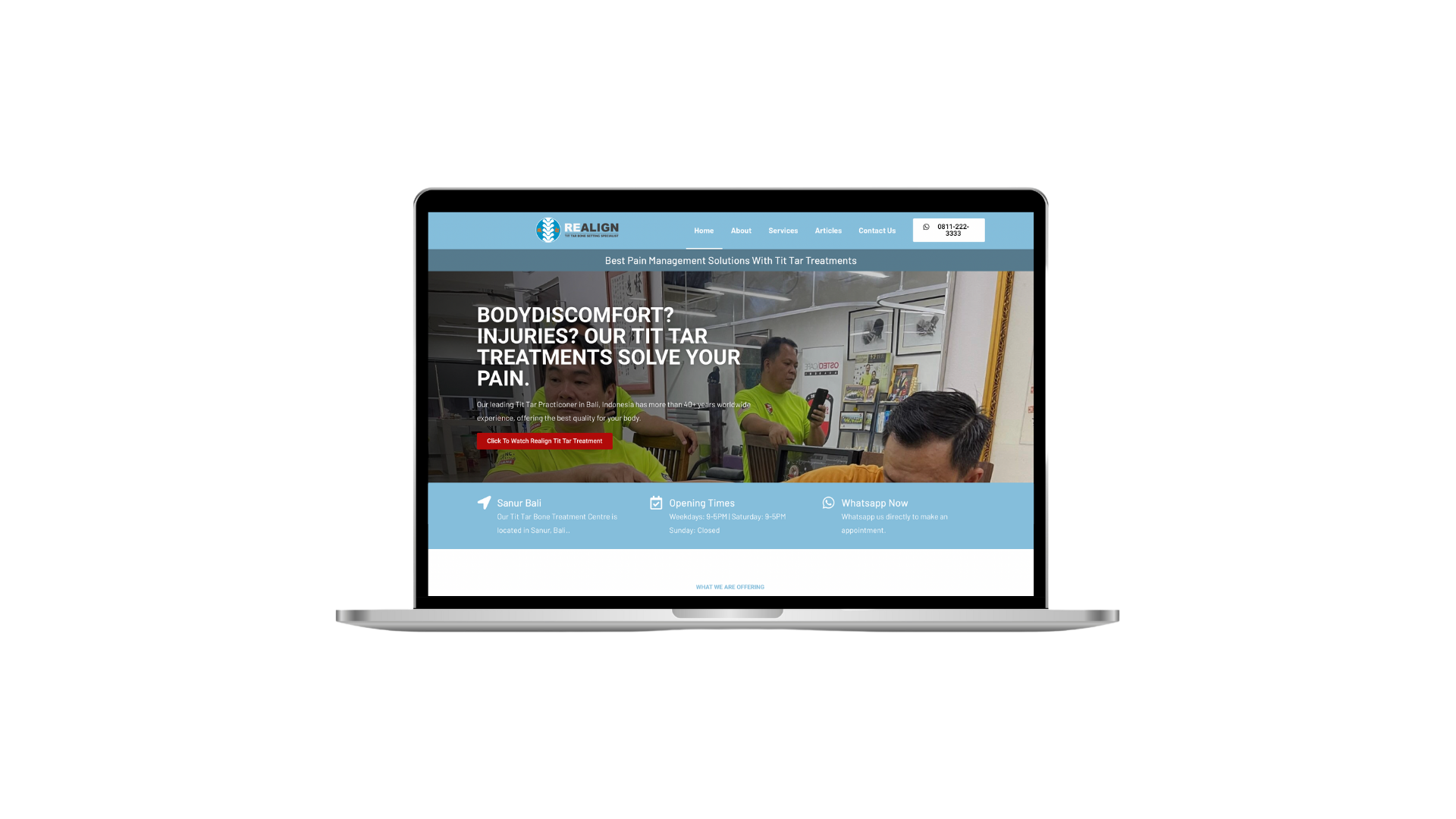 Selamat datang di Realign Tit Tar Wellness Centre di Sanur, Bali. Spesialisasi dalam Tit Tar, teknik penyetelan tulang tradisional, Realign berdedikasi untuk penyembuhan holistik dan kesejahteraan fisik. Dalam kemitraan dengan Realign, Search Synergy sedang mengembangkan situs web yang mencerminkan komitmen pusat tersebut terhadap perawatan yang luar biasa. Tujuan kami adalah menciptakan ruang online yang ramah di mana pengunjung dapat dengan mudah mempelajari dan memesan layanan Tit Tar.